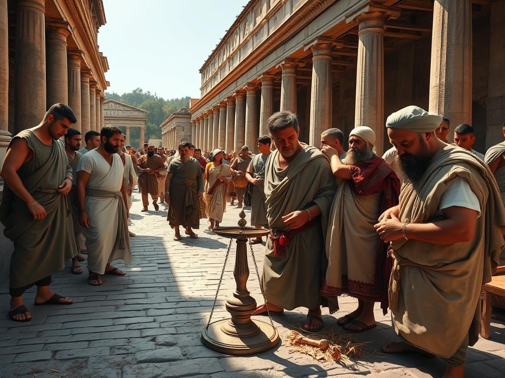 En el plano institucional, edictos de pretores, fórmulas contractuales y prácticas notariales sustentaron la administración del mercado. Los contratos escritos y las actas públicas servían de prueba ante tribunales, mientras que las penas por fraude y medidas sobre calidad protegían la confianza comercial. Ejemplo concreto: los «argentarii» y los publicanos intermediaban cobros y préstamos, desplazando capital y permitiendo créditos a comerciantes; las tasas portuarias (portoria) y controles de pesos y medidas estandarizaban el intercambio y gravaban el tráfico mercantil.